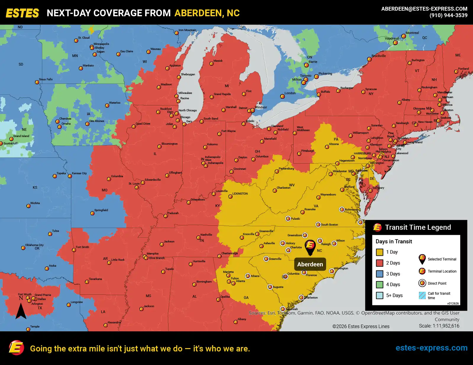 Estes offers next-day direct LTL freight shipping from the Fayetteville area to Charlotte, Raleigh, Richmond, Norfolk, Greensboro, Savannah, Columbia, and Charleston, SC, as well as next-day LTL to Atlanta, Philadelphia, DC, Baltimore, Lexington, Knoxville, and more.