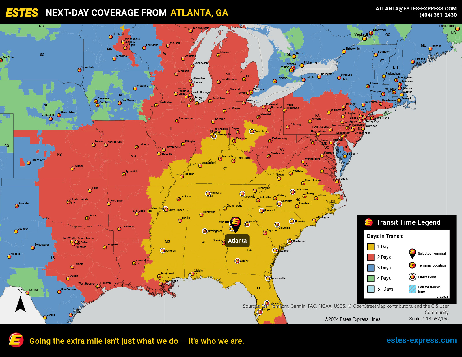 Need reliable LTL freight shipping? Estes offers next-day direct lanes from Atlanta to Charlotte, Nashville, Jacksonville, Indianapolis, Orlando, Tampa, Columbus, Memphis, Knoxville, Birmingham, and Greensboro, as well as next-day shipping to Cincinnati, Raleigh, Louisville, Lexington—and more.