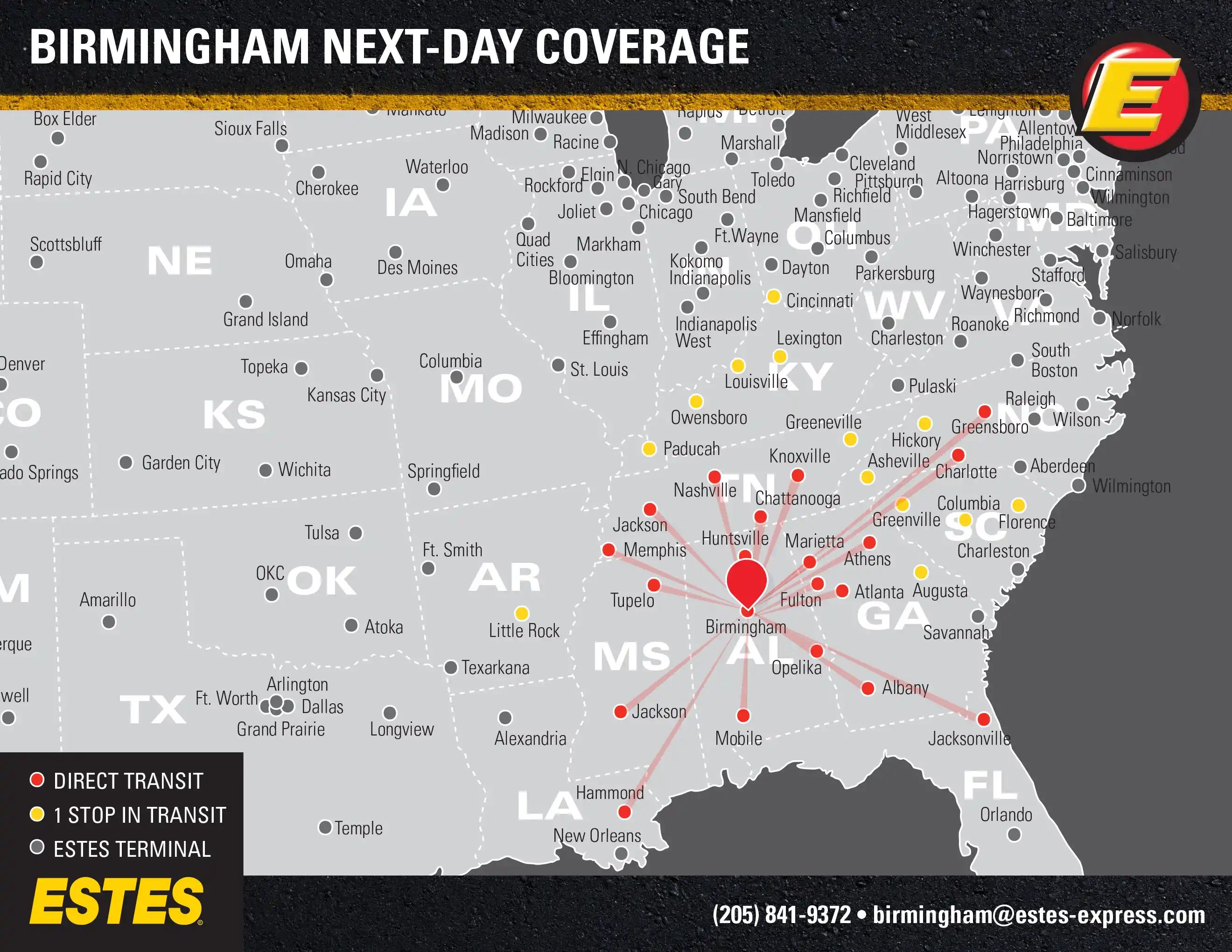 Need reliable LTL freight shipping? Estes offers next-day direct lanes from the Birmingham-Tuscaloosa area to Atlanta, Nashville, Jacksonville, New Orleans, Memphis, Knoxville, Greensboro, and Huntsville, as well as next-day shipping to Charlotte, Cincinnati, Louisville, Lexington, Mobile, Little Rock, Columbia—and more.