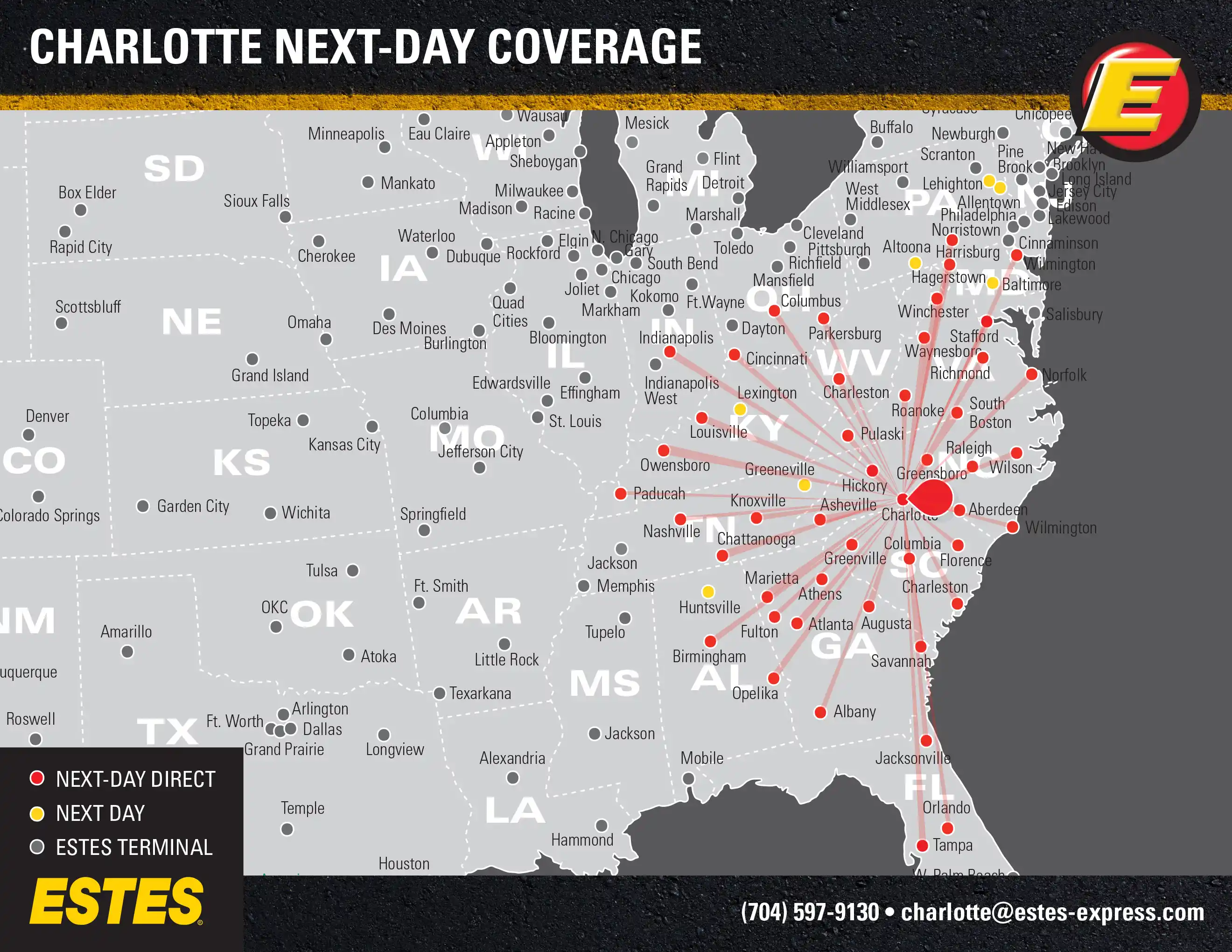 Need reliable LTL freight shipping? Estes offers next-day direct lanes from Charlotte to Atlanta, Nashville, Indianapolis, Jacksonville, Columbus, Cincinnati, Orlando, Baltimore, Raleigh, Louisville, Richmond, and Norfolk, as well as next-day shipping to Baltimore, Lexington, Huntsville, and more.
