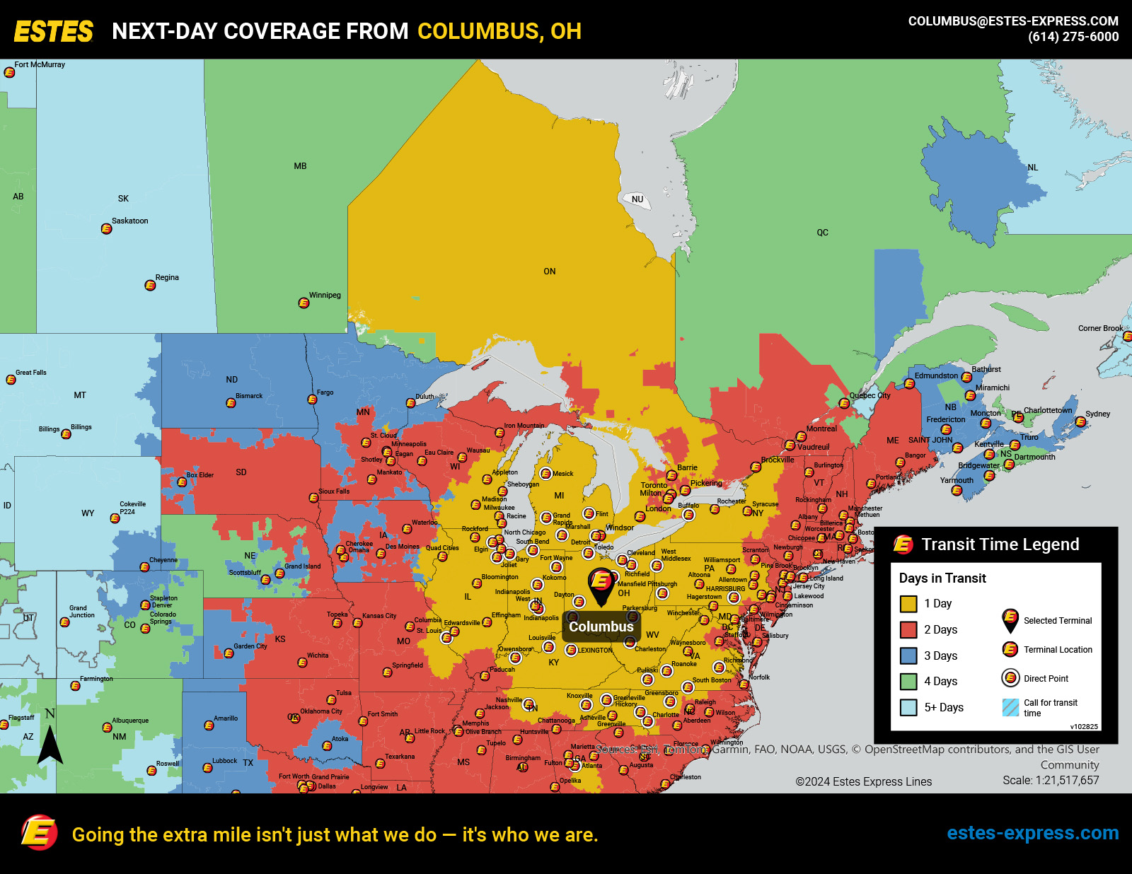 Estes offers reliable next-day LTL shipping from Columbus to Toronto, London, Windsor, and nearby Ontario destinations—supported by our nationwide team of Border Concierges and featuring some of the best freeze protection in the industry.