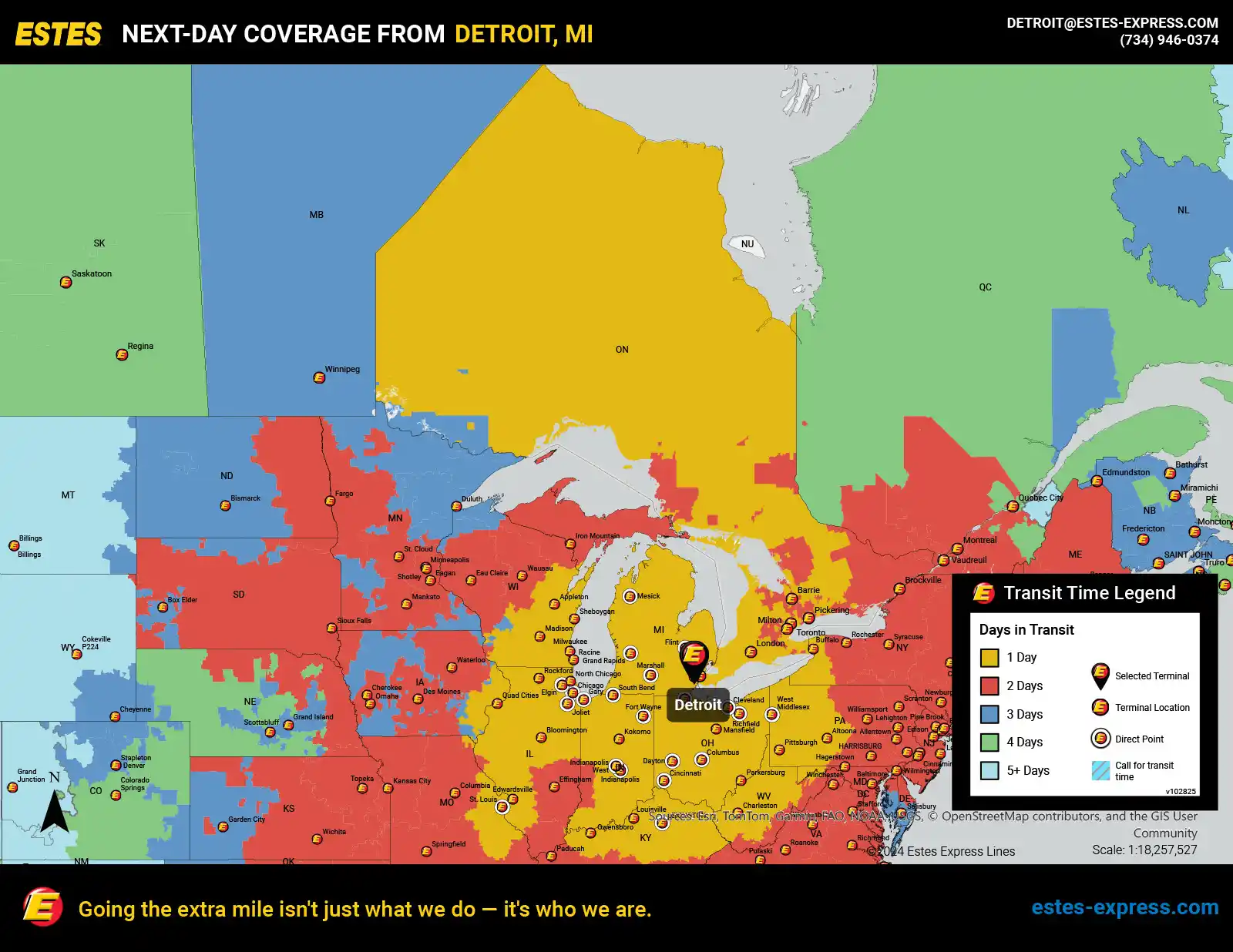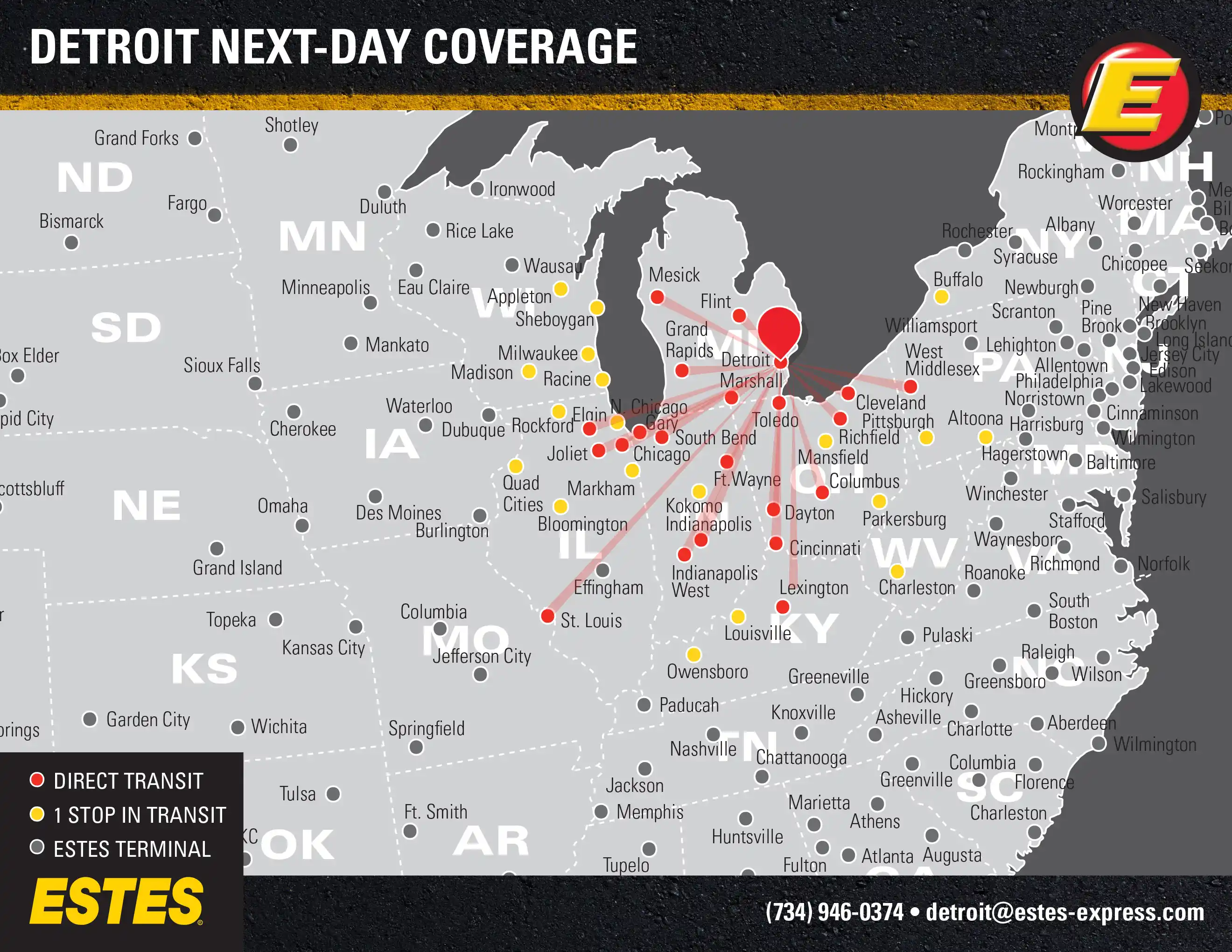 Estes offers next-day direct LTL freight shipping from Detroit to Chicago, Indianapolis, Cleveland, Columbus, Cincinnati, St. Louis, and Lexington, as well as next-day LTL to Toronto, Milwaukee, Pittsburgh, Buffalo, Louisville, and more.