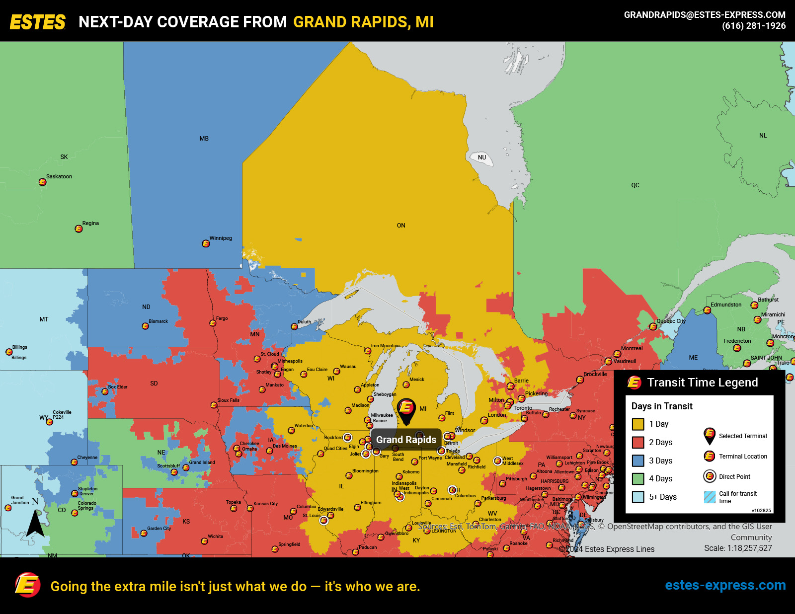 Estes offers next-day direct LTL shipping from Grand Rapids to Chicago, Indianapolis, Detroit, Columbus, St. Louis, and Toledo, as well as next-day LTL to Toronto, Milwaukee, Cleveland, Cincinnati, Louisville, Lexington, and more.