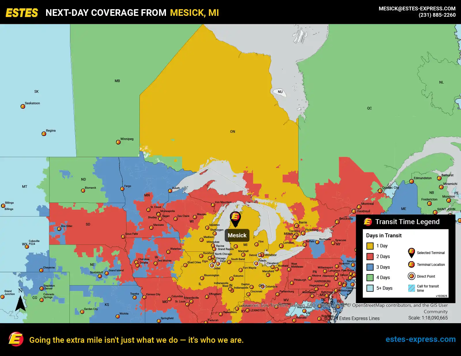 Estes offers next-day direct LTL shipping from the Mount Pleasant-Traverse City area to Chicago, Detroit, and Columbus, as well as next-day LTL to Indianapolis, Toronto, Cleveland, Cincinnati, Milwaukee, Louisville, and more.