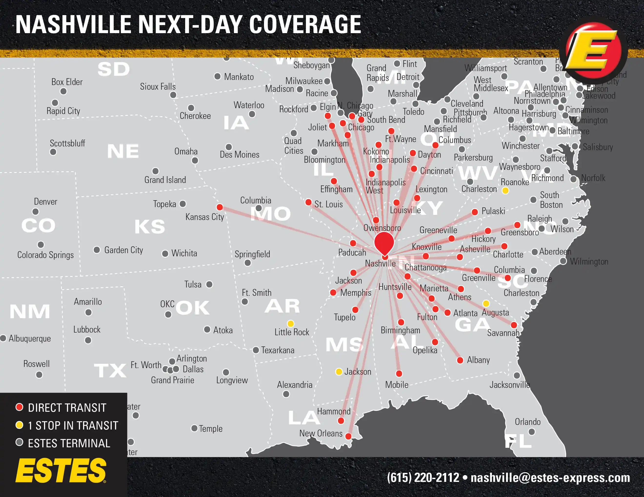 Need reliable LTL freight shipping? Estes offers next-day direct lanes from Nashville to Chicago, Atlanta, Charlotte, Indianapolis, Kansas City, Cincinnati, Columbus, Memphis, St. Louis, New Orleans, Louisville, Lexington, Knoxville, Huntsville, Birmingham, Mobile—and more.