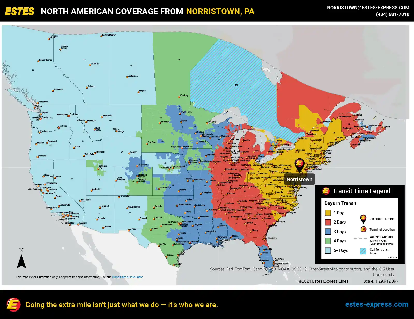 Estes offers next-day LTL freight shipping from Philadelphia to NYC, Boston, Toronto, Charlotte, DC, Pittsburgh, Cleveland, Cincinnati, Columbus, Buffalo, Montreal, Baltimore, Richmond, Norfolk, Albany—and more.