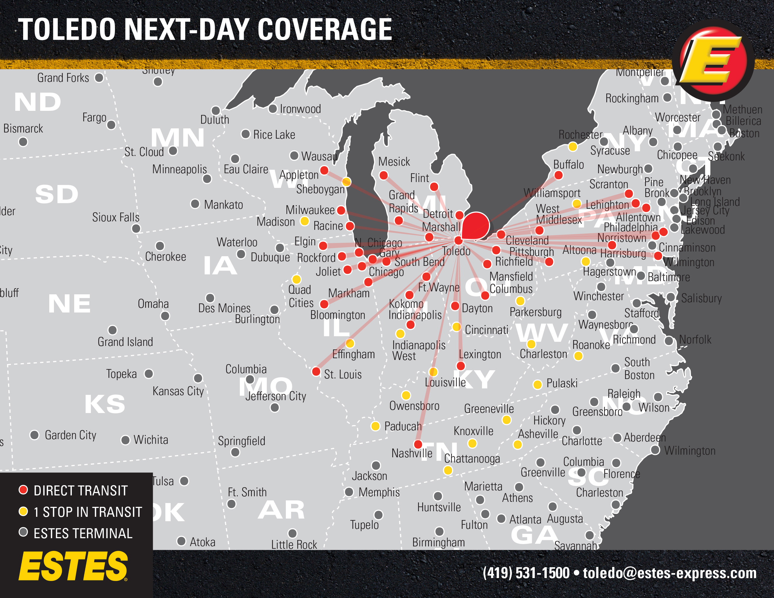 Contact us today to find out why businesses in Toledo count on us to get their LTL freight where it needs to go, when it needs to get there. From short-haul to long-haul, Estes does it all.